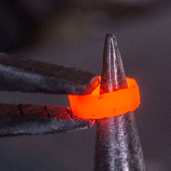Polotovary prstenů umístněné v žáru ohně se musí zahřát na vysokou teplotu, aby je bylo možné kovat. Zahřátím ocel získá poddajnost a lze jí tvarovat do potřebné veliksoti a tvaru.