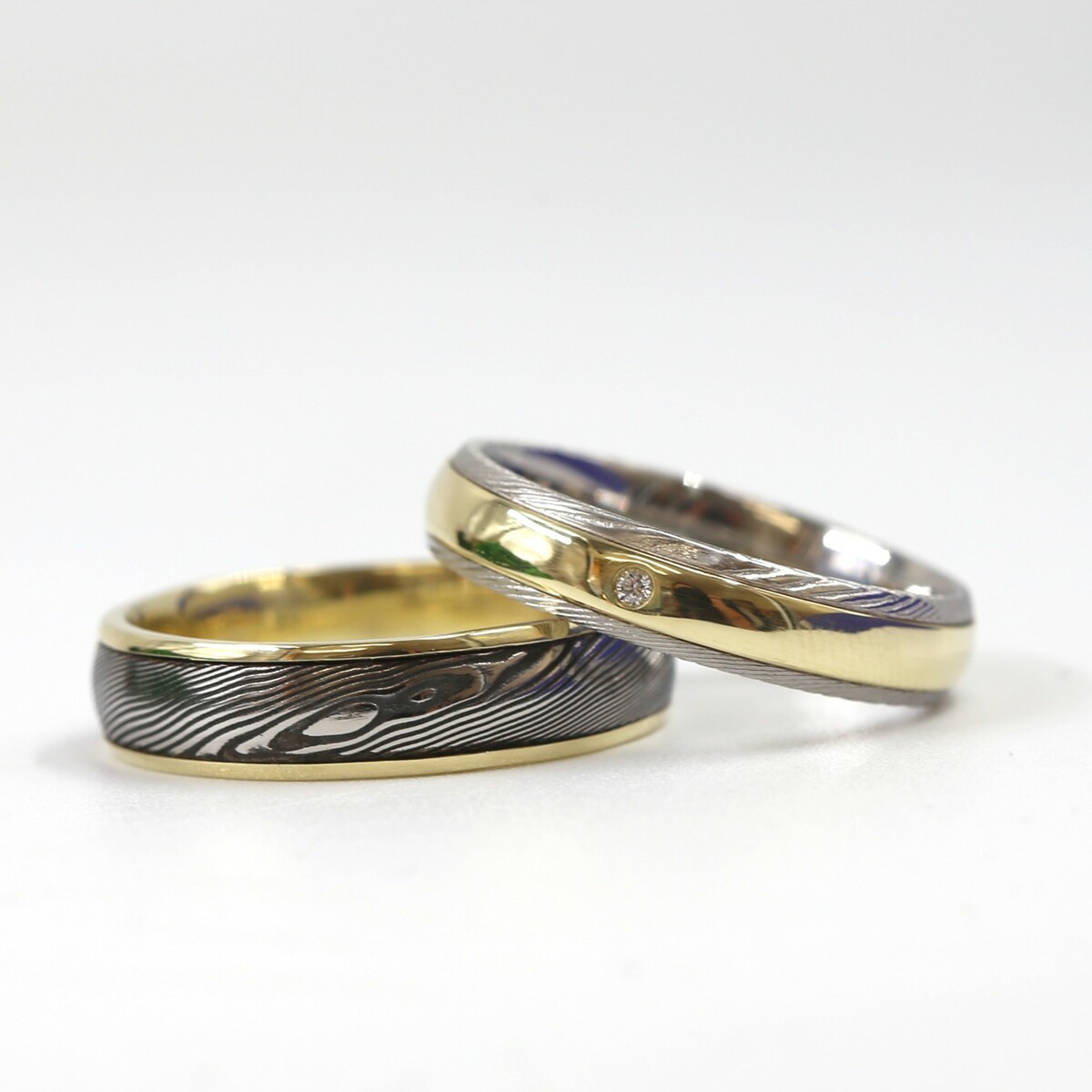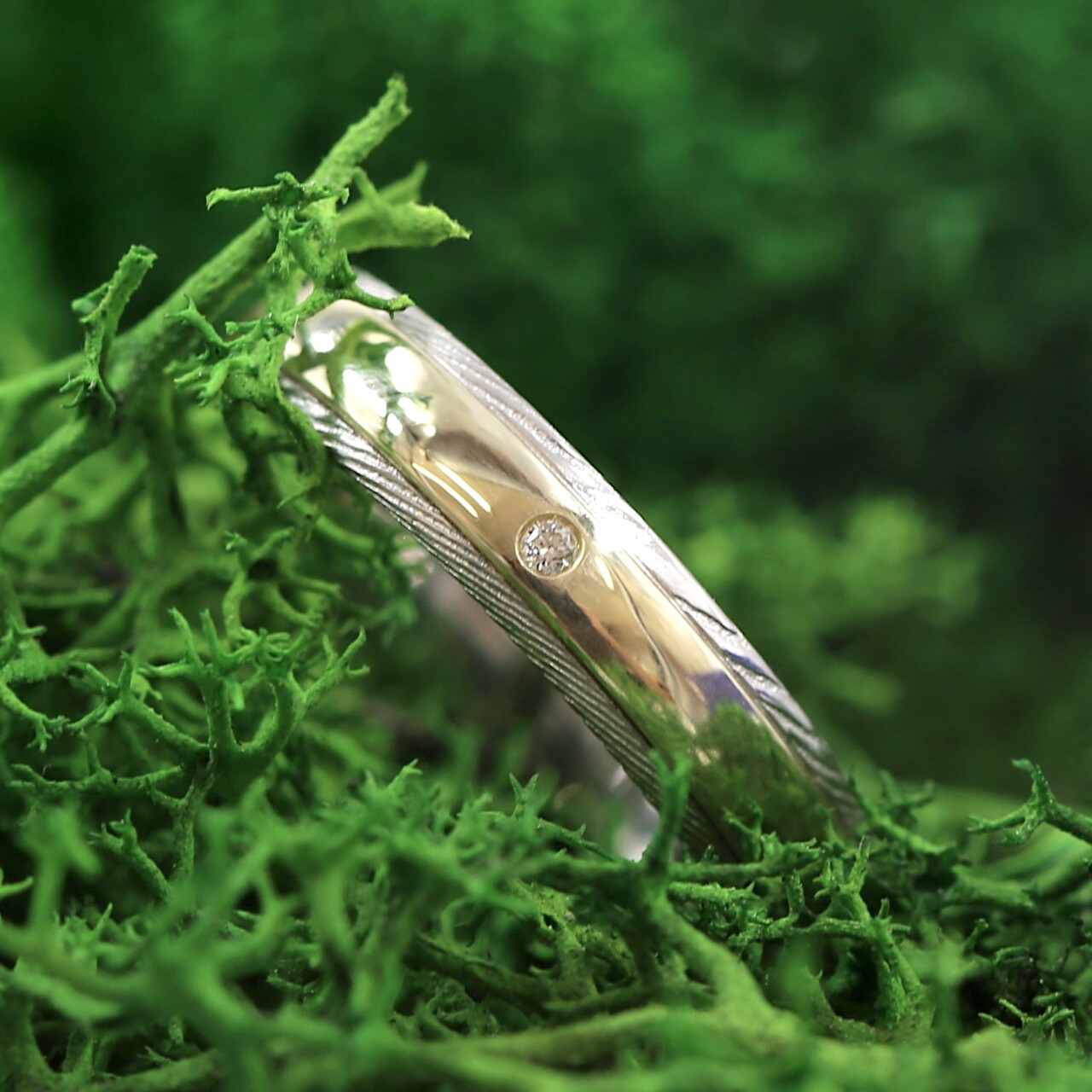 Ručně vykovaný prsten z nerezové oceli damasteel, doplněný zlatým kroužkem a osazený diamantem. Nabízíme ho jako snubní prsten, ale stejně krásně vynikne i jako zásnubní prstýnek nebo dárek z lásky ♡.