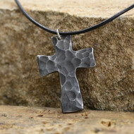 Přívěsek ve tvaru křížku je ručně kovaný z nerezové oceli.