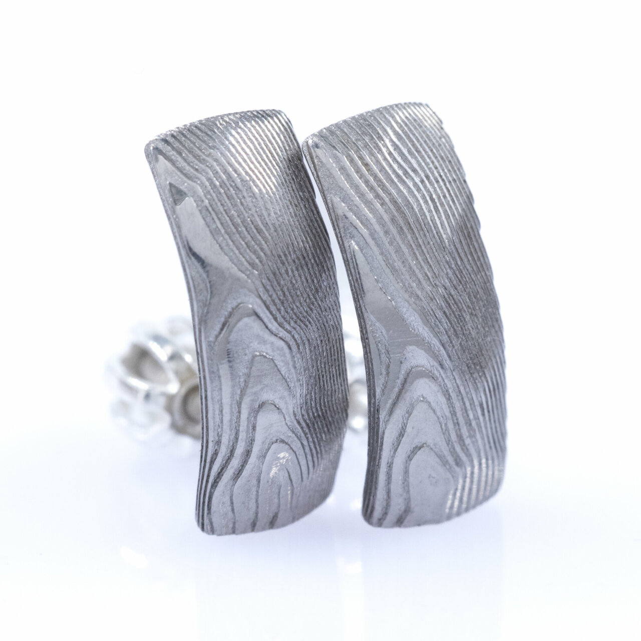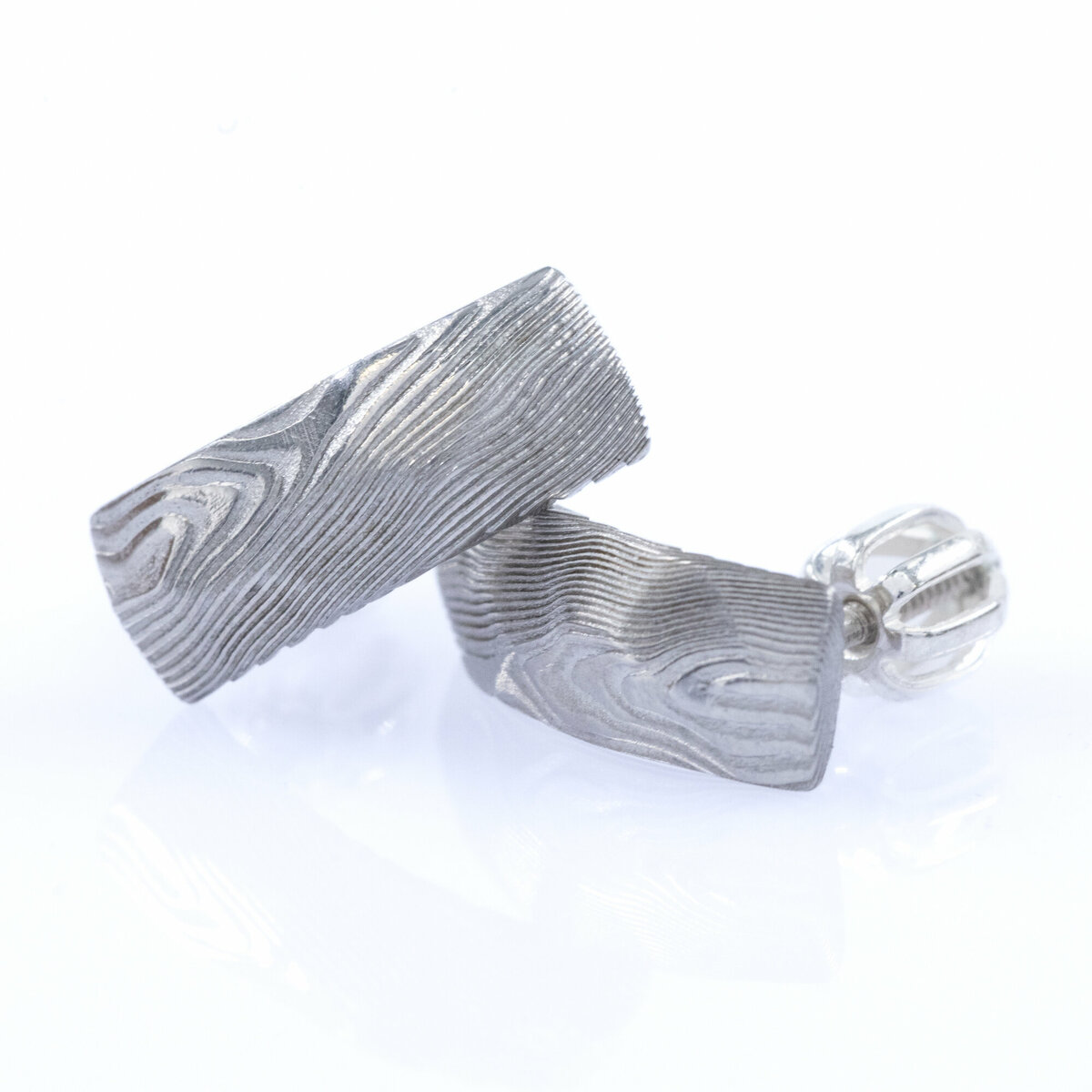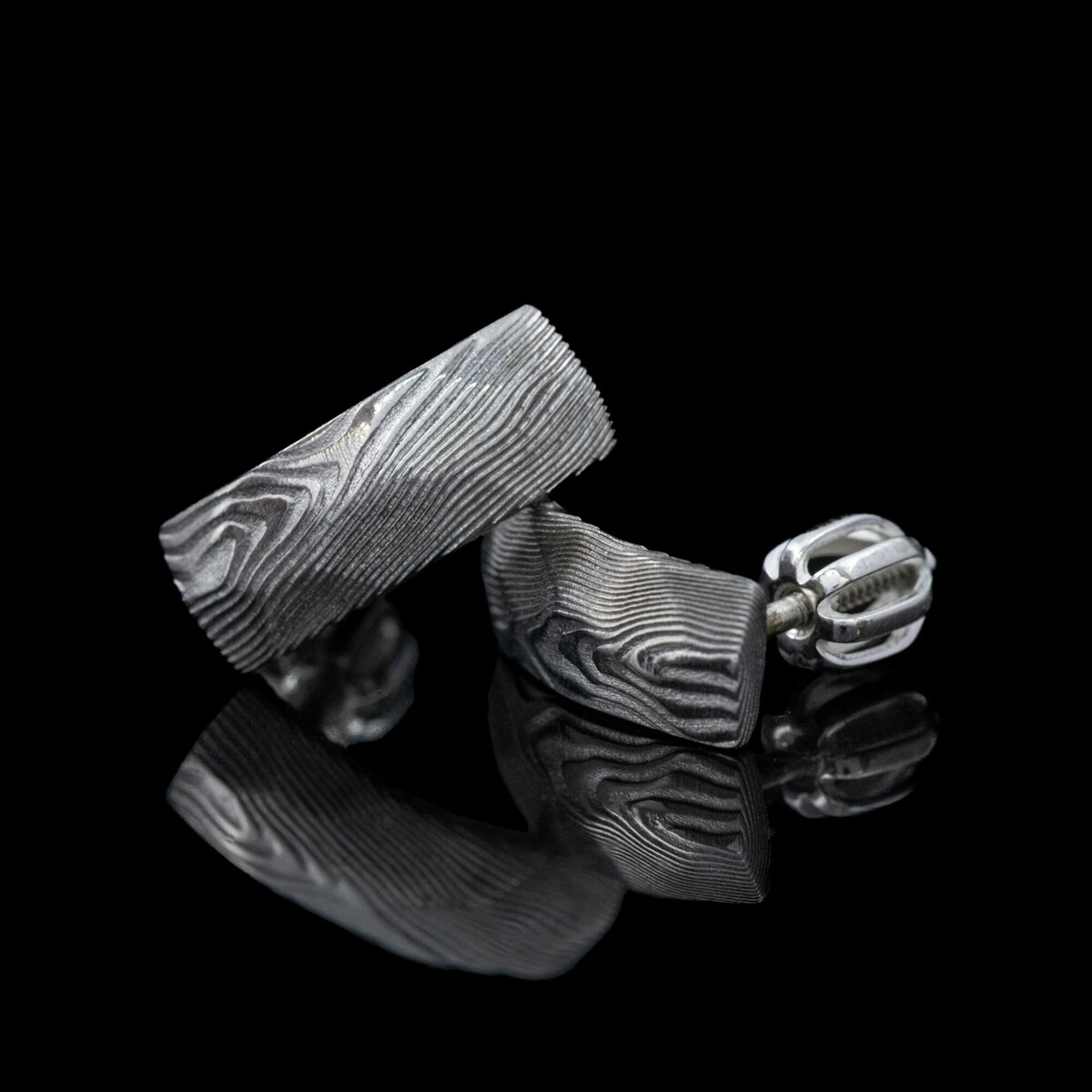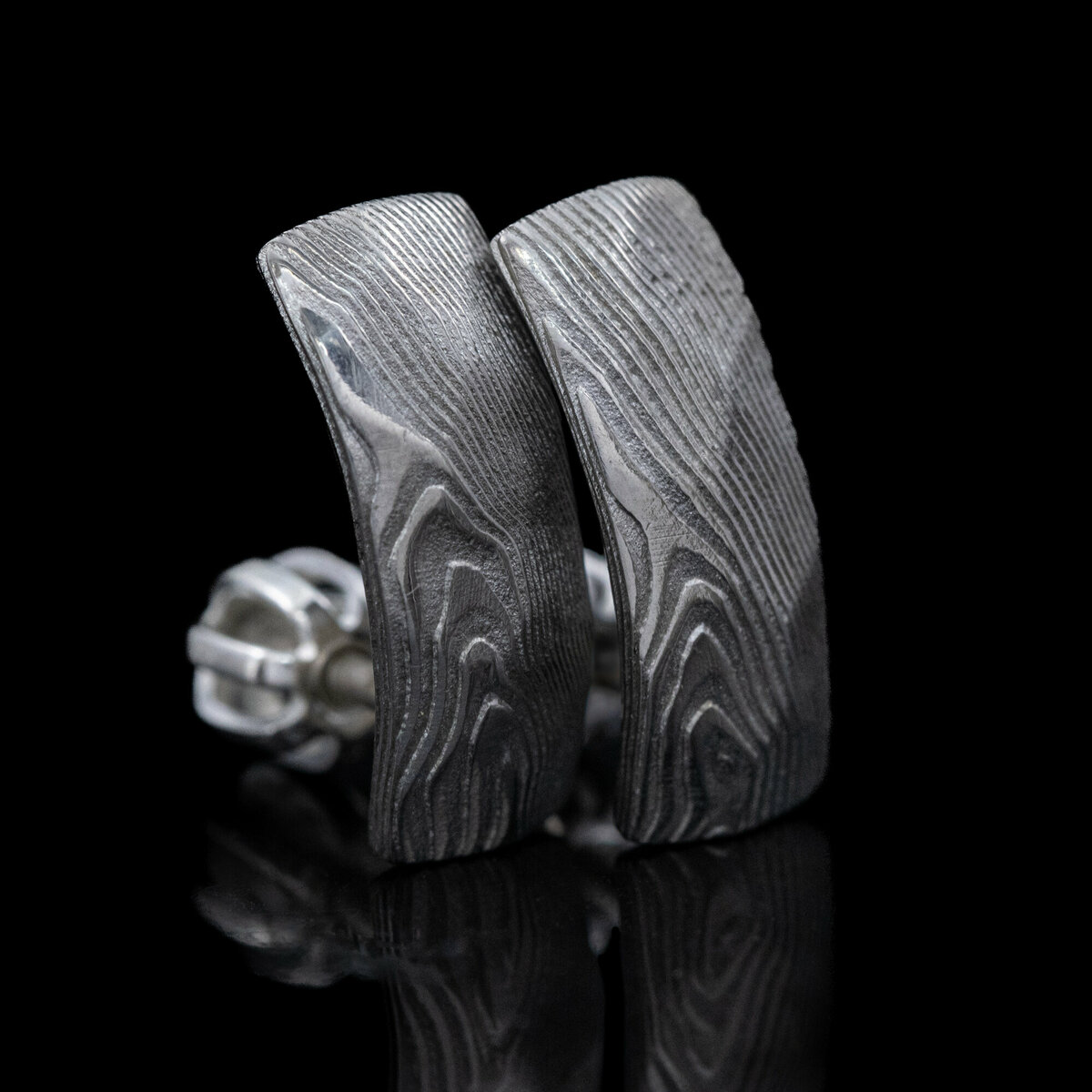 Náušnice ručně vykované z damaškové oceli, která vyniká svou krásnou kresbou připomínající dřevo.