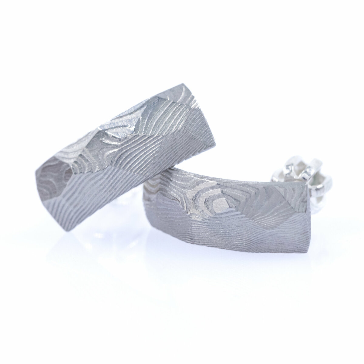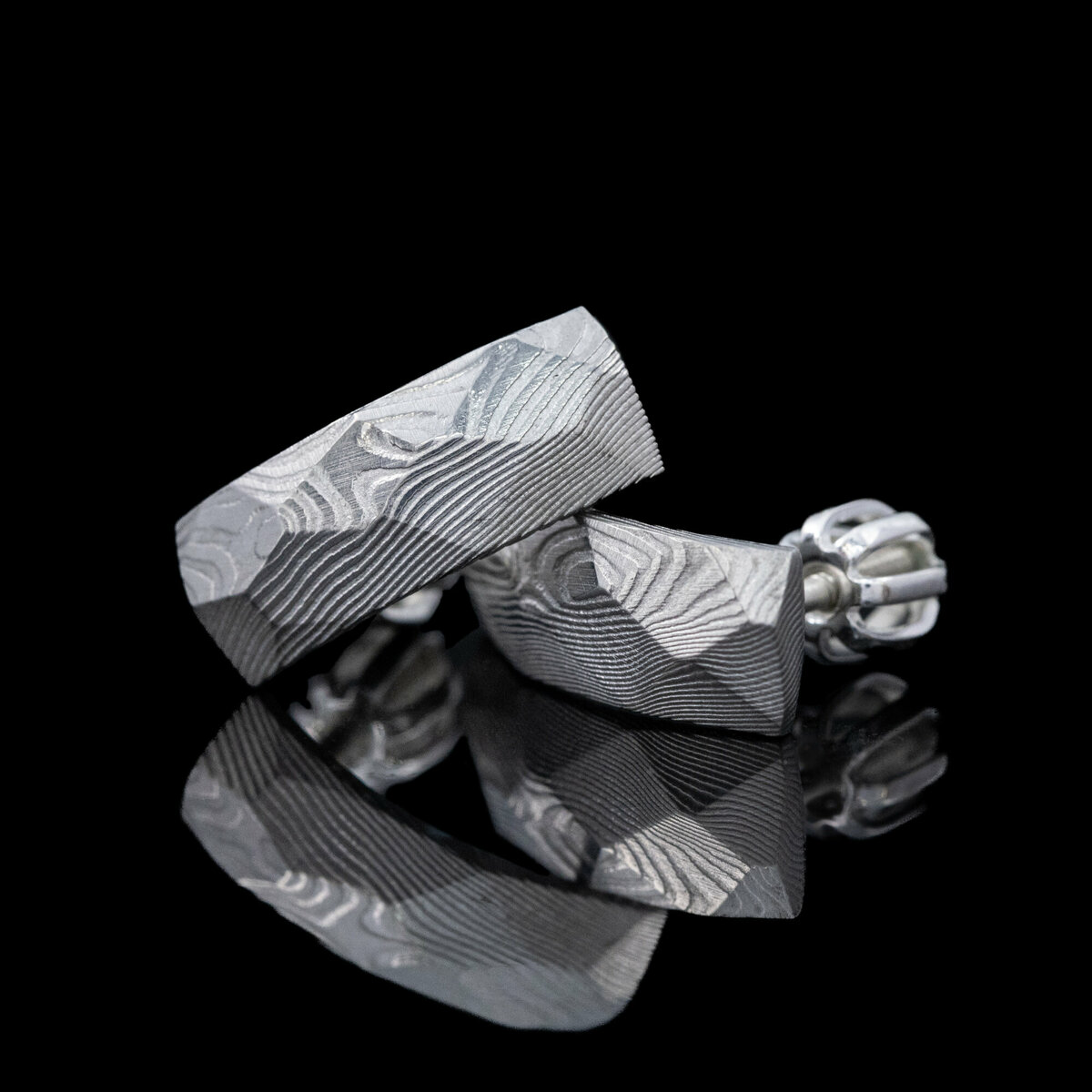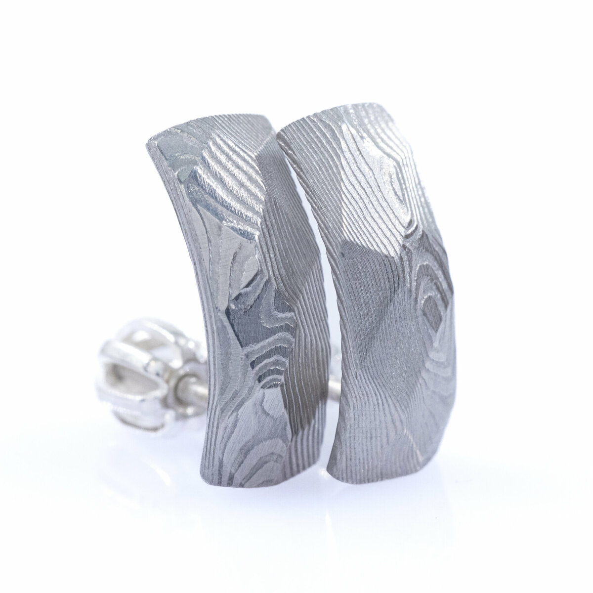 Náušnice ručně vykované z damaškové oceli, která vyniká svou krásnou kresbou připomínající tekoucí vodu.