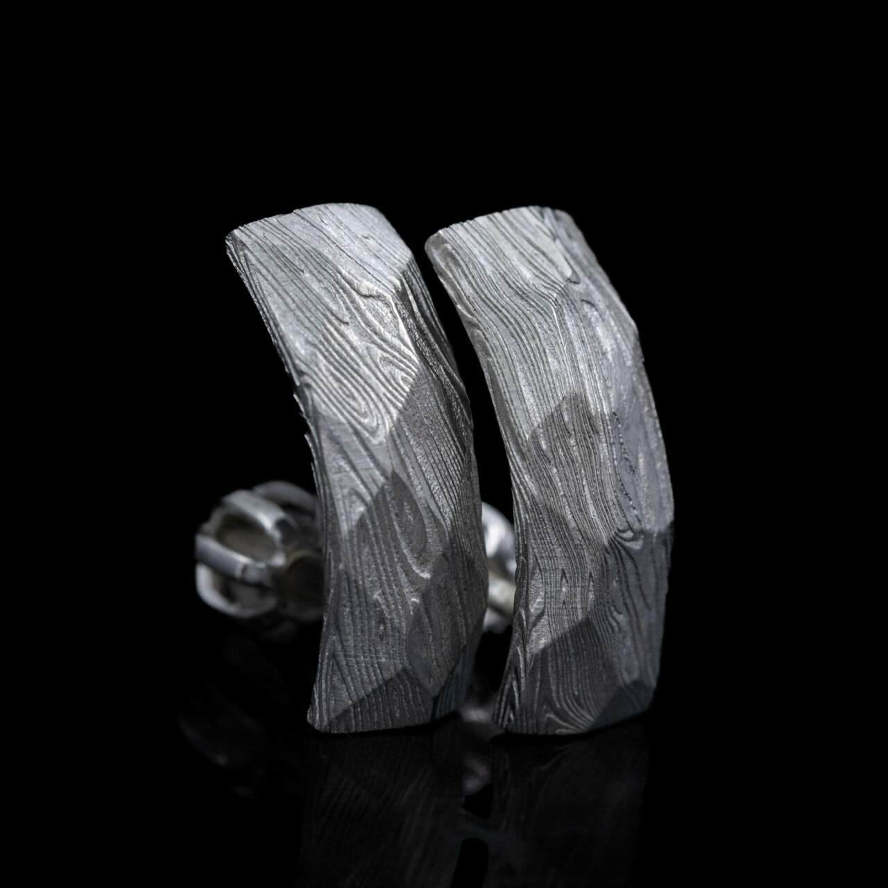 Náušnice ručně vykované z damaškové oceli, která vyniká svou krásnou kresbou připomínající tekoucí vodu.