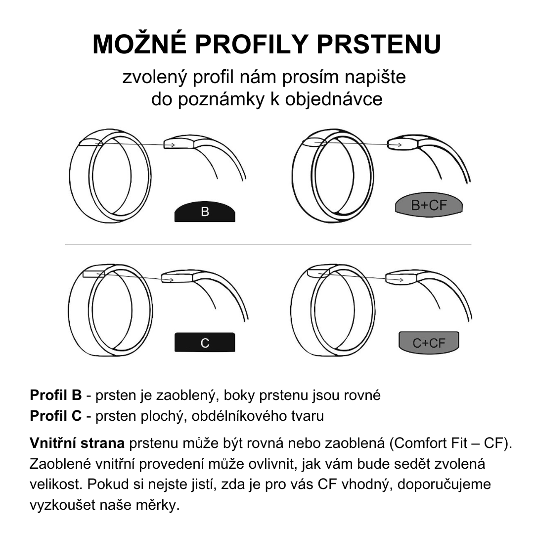 Abychom vám mohli prsten vyrobit, potřebujeme vědět požadovanou velikost, šířku, tloušťku a profil prstenu (viz přiložená fotka). Požadované parametry vyberte v rozevíracím seznamu, případně doplňte do poznámky. Maximální velikost prstenu je 71.