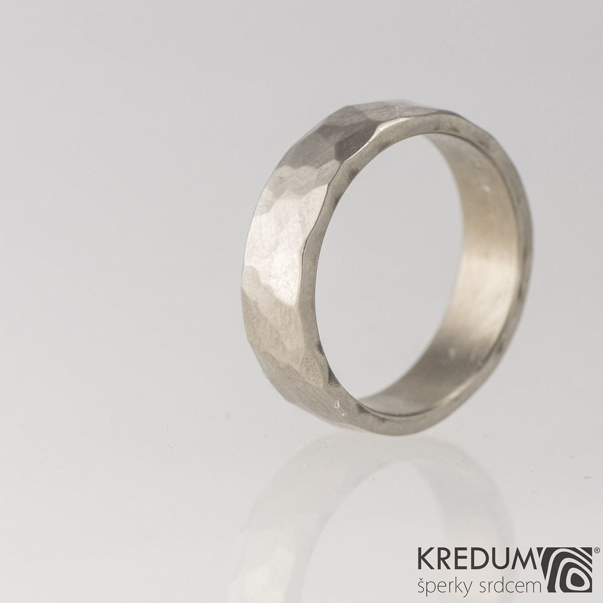 Povrch prsteňa je kovaný, lesklý. Prsteň má mierne kované strany. Vnútorná strana prsteňa je hladko obrúsená, aby sa prsteň pohodlne nosil. Ponúkame aj prsteň s matným povrchom.