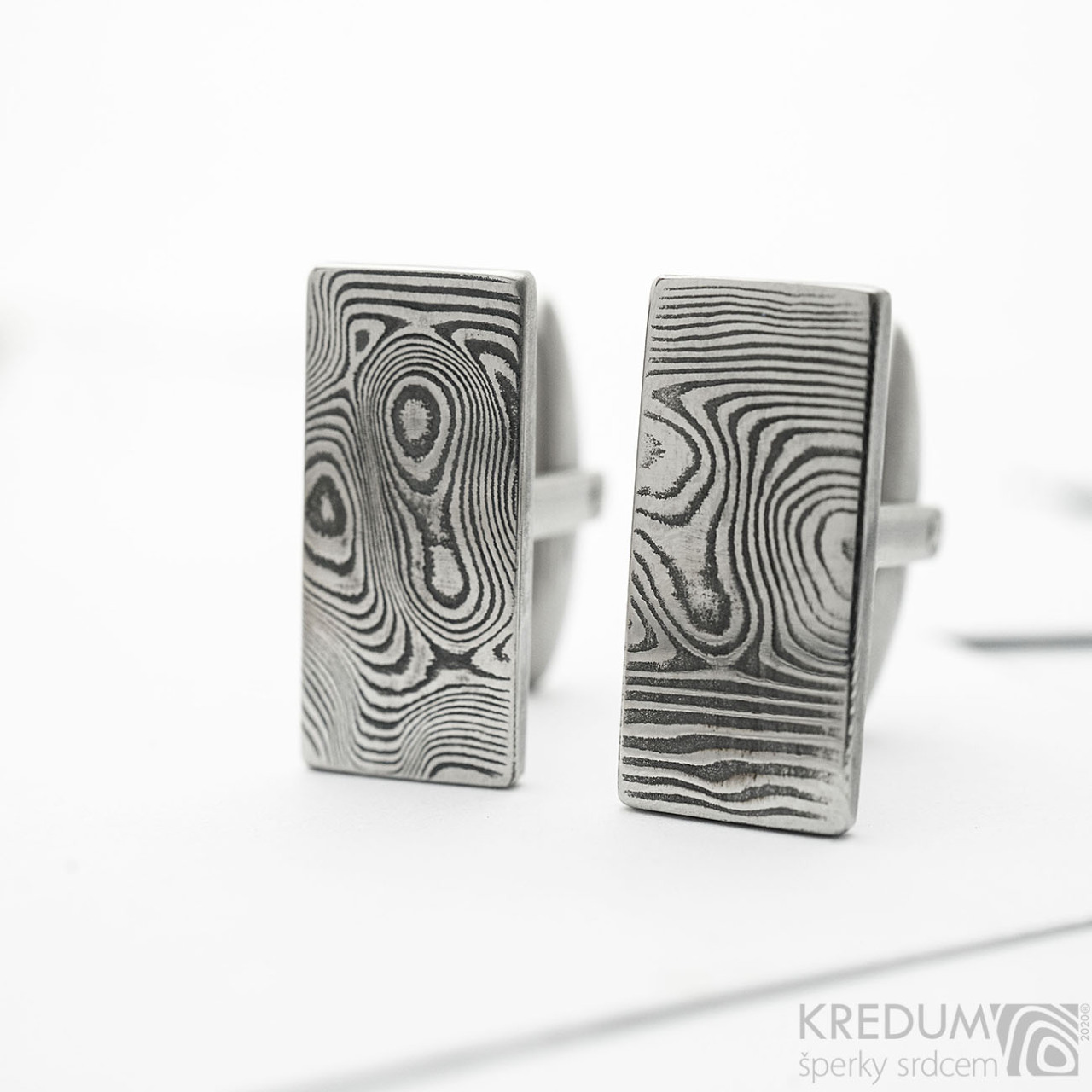 Manžetové knoflíčky ručně kované z nerezové oceli damasteel. Jedná se o materiál, kde dochází k vrstvení dvou nerezových ocelí. Tím vzniká neopakovatelná struktura, která dává knoflíčkům nevšední a jedinečný vzhled připomínající dřevo.