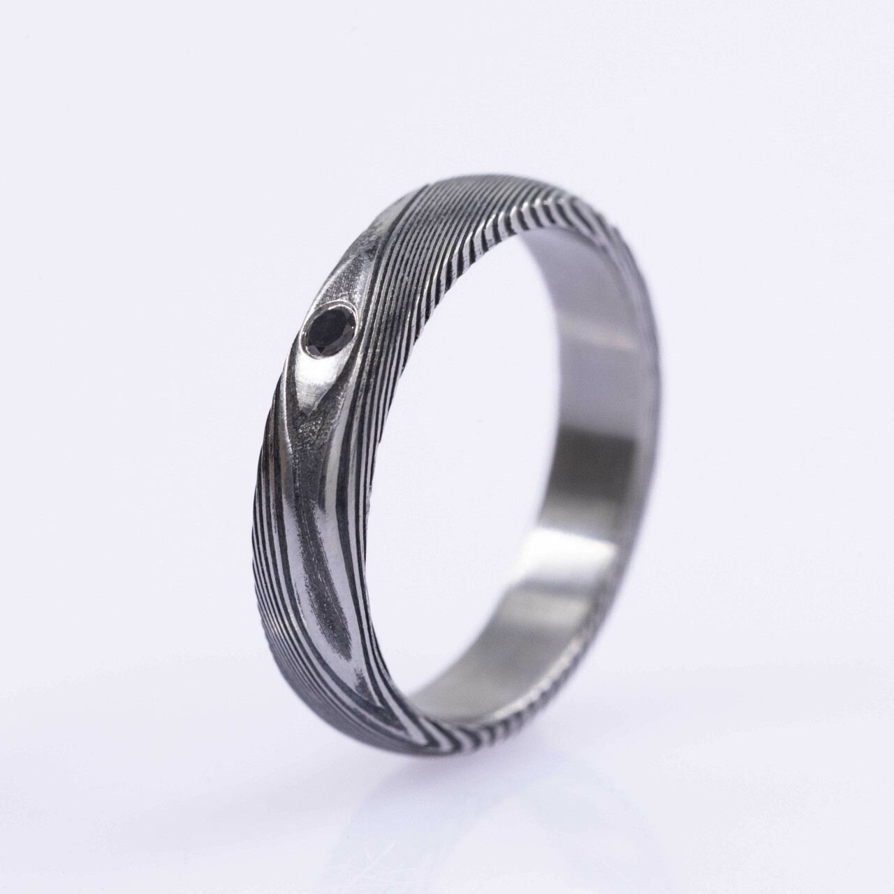 Ručně kovaný nerezový snubní prsten z vrstvené oceli damasteel - Prima.