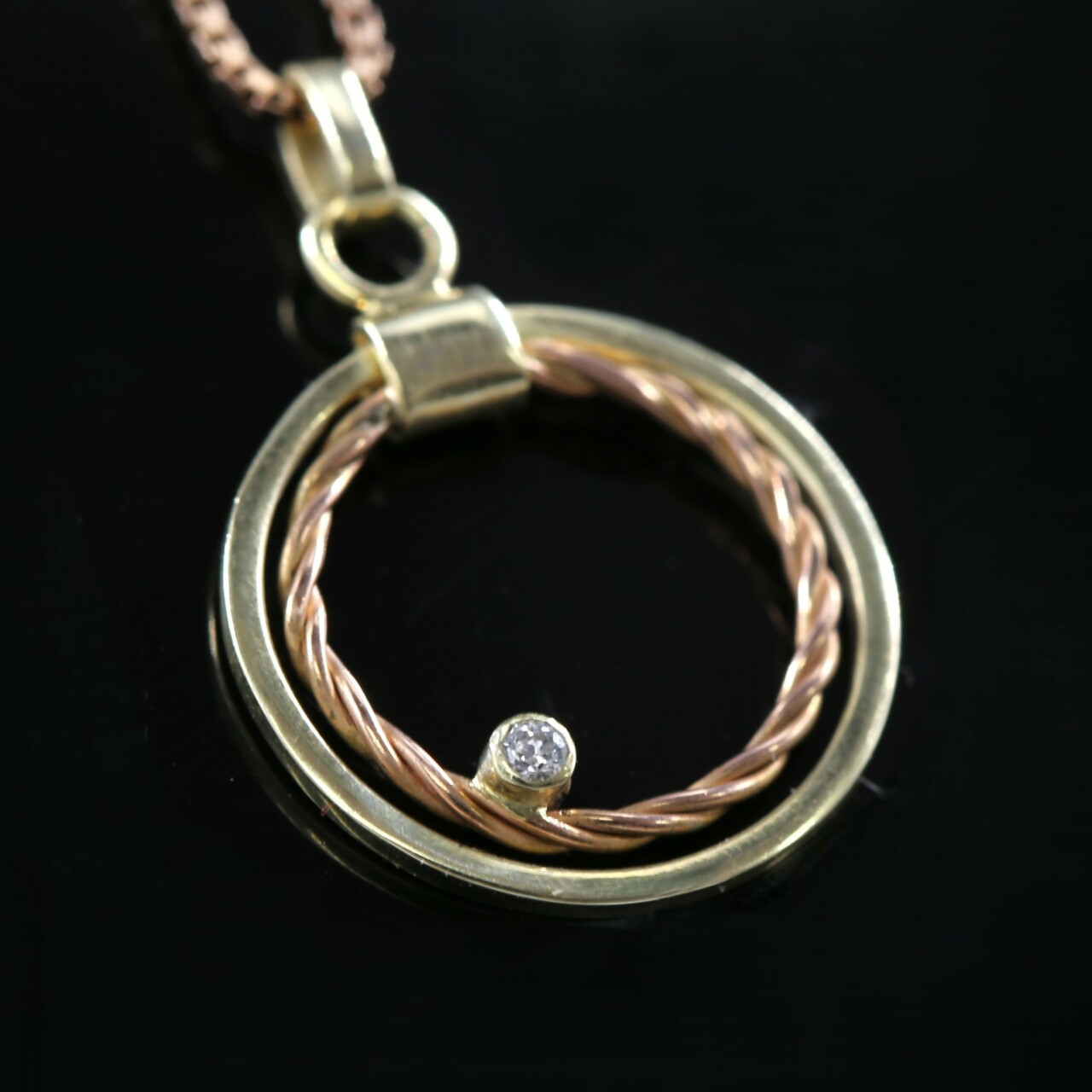 Zlatý prívesok z bieleho a žltého zlata s prírodným diamantom – ručná výroba.