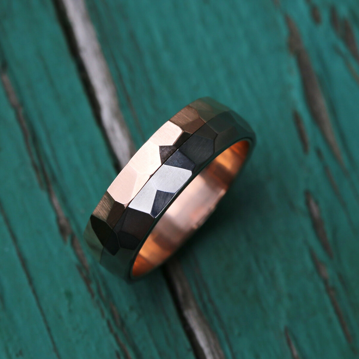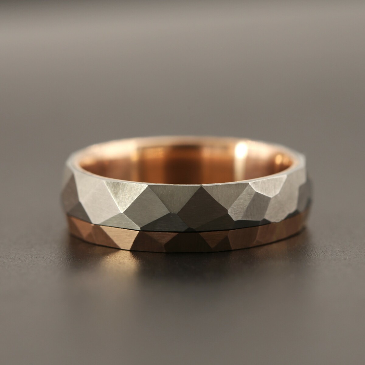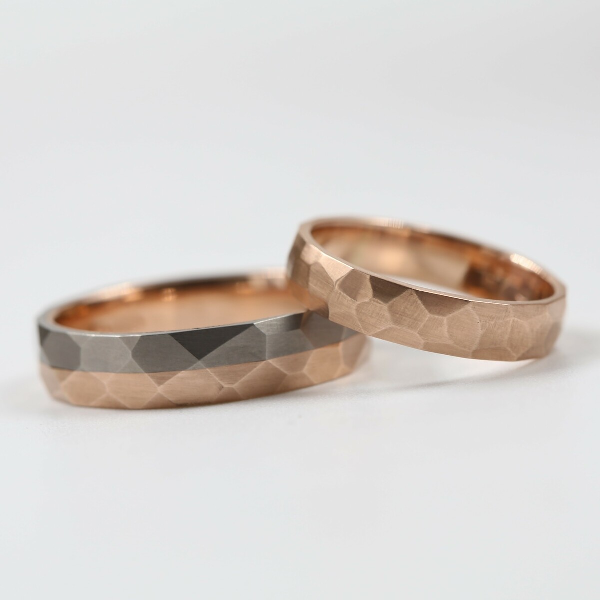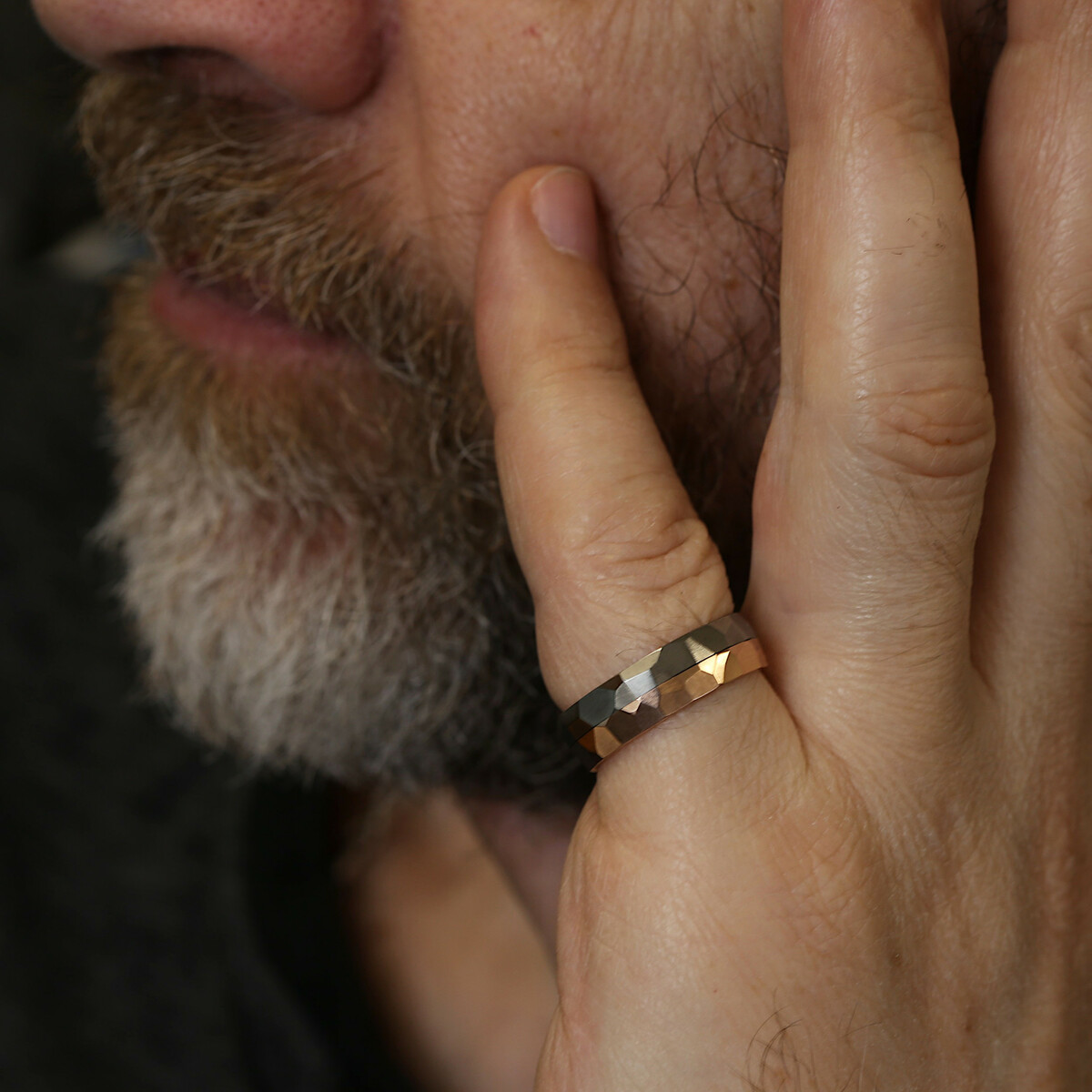 Drahé kovy snadno kombinujeme i s nerezovou ocelí damasteel nebo titanem. Prsten díky spojení více druhů materiálů a jejich vlastností získá punc neodolatelné jedinečnosti. Ze spojení drahých kovů vzniká jedinečné MOKUME GANE, které se pyšní jedinečnou strukturou prolnutých kovů.