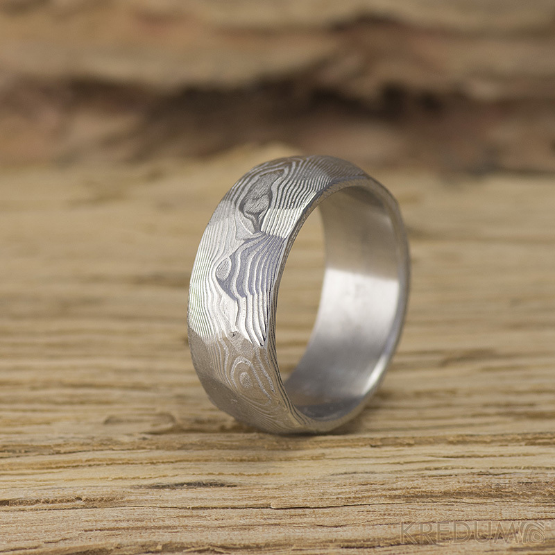 Ručně kované snubní prsteny z nerezové oceli damasteel. Jedná se o materiál, kde dochází k vrstvení dvou nerezových ocelí. Tím vzniká neopakovatelná struktura, která dává prstenům nevšední a jedinečný vzhled připomínající dřevo. Lze je vyrobit také v jiných strukturách.