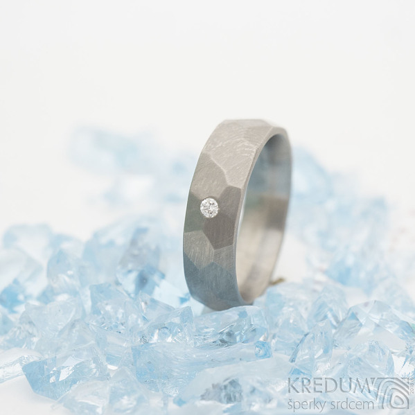 Prsten je ručně vykován z titanu a osazen broušeným krystalem přírodního diamantu o průměru 2 mm, briliantového brusu, který je neupravovaný.