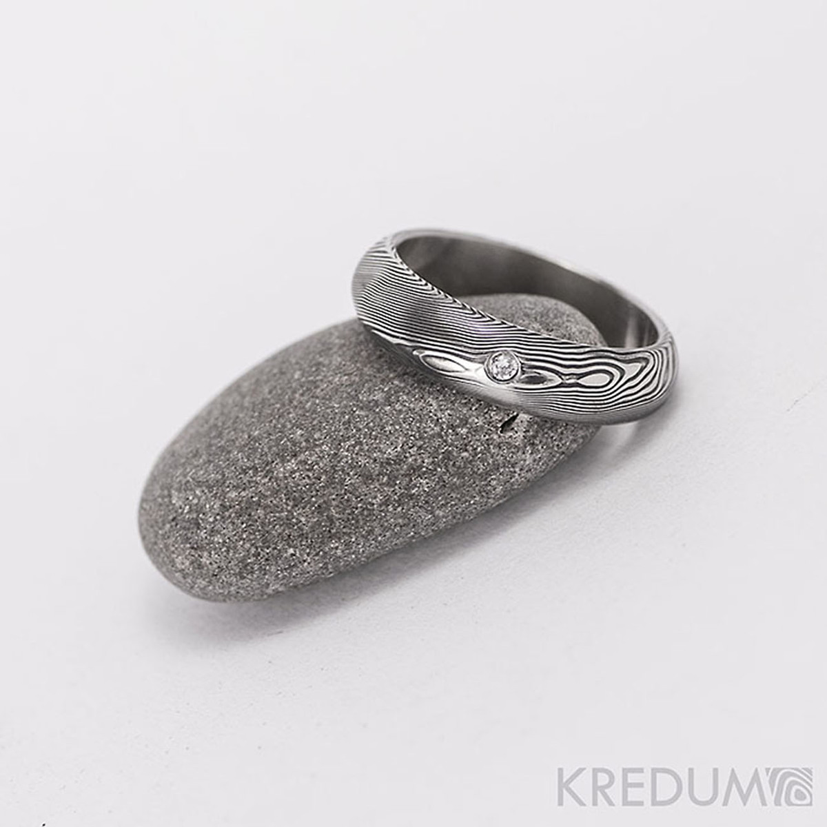Ručně kované snubní prsteny z nerezové oceli damasteel. Jedná se o materiál, kde dochází k vrstvení dvou nerezových ocelí. Tím vzniká neopakovatelná struktura, která dává prstenům nevšední a jedinečný vzhled připomínající dřevo. Lze je vyrobit také v jiných strukturách.