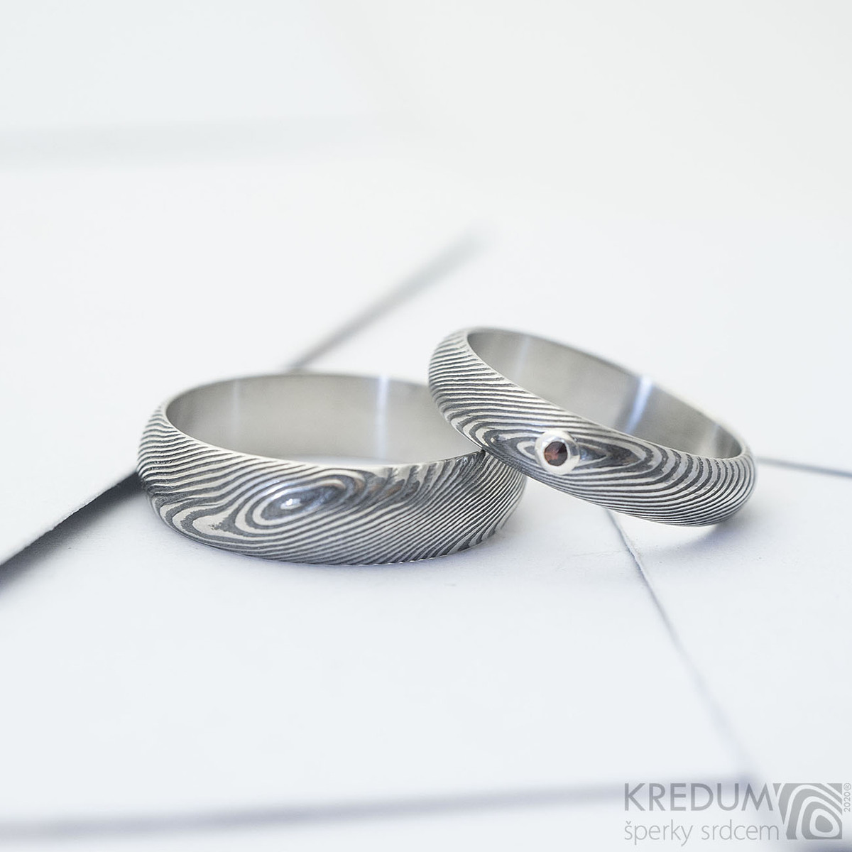 Ručně kované snubní prsteny z nerezové oceli damasteel. Jedná se o materiál, kde dochází k vrstvení dvou nerezových ocelí. Tím vzniká neopakovatelná struktura, která dává prstenům nevšední a jedinečný vzhled připomínající dřevo. Lze je vyrobit také v jiných strukturách.